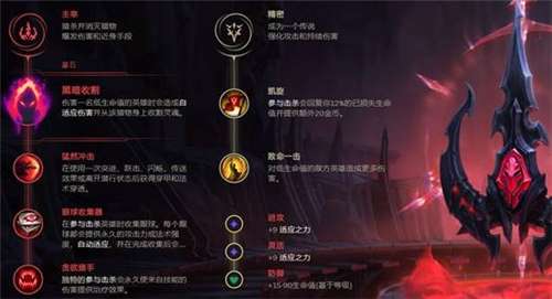 黑暗收割攻击生命值低于一半的敌人触发,永久提升伤害,猛然冲击搭配EQ技能,贴脸后获得穿甲,眼球收集器增加适应力,贪欲猎手将部分技能伤害转化为治疗效果,凯旋参与击杀得到治疗,致命一击对生命值低的敌人造成更多伤害。