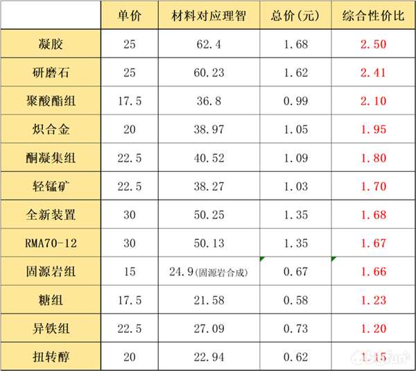 对于蓝色材料而言,可以与紫色材料放在一起进行综合参考。综合性价比表格如下图所示(降序排列),越前面越推荐优先兑换: