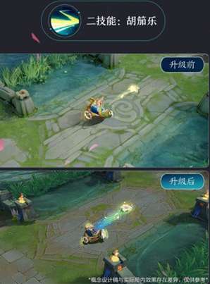二技能胡笳乐:技能的线条颜色同样是变为蓝绿色,同时这个皮肤的花朵效果变得更加明显,在释放的路径上还会出现一些音符,效果非常的不错。
