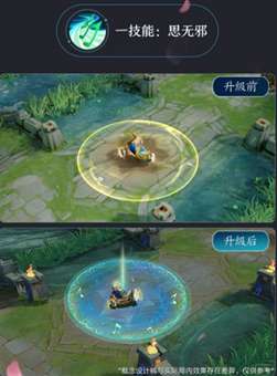 一技能思无邪:这个技能效果全面变化,将原来的黄色特效改成了蓝绿的效果还添加了非常多的效果花纹和一些音符,特效的变化非常的大。