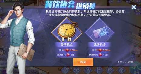 餐厅偶尔会有餐饮协会的工作人员来上门推销,先别急着拒绝呀~推销人员的颜值值得你听一听他的推销内容(才不是因为这个),推销的内容一般为稀有礼品(用来赠送合伙人)和升级道具,可以说物美价廉了。当然了,如果你确实不需要,可以婉拒不买哟。