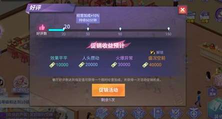 餐厅食物精美、招待热情,就会收到食客的好评哟,看到他们的点赞了吗?这都是他们的心意,点击就可以收取好评,好评达到一定数量可以为餐厅带来加成增益,且根据好评数量有不同的增益等级,还等什么,大拇指点起来吧!