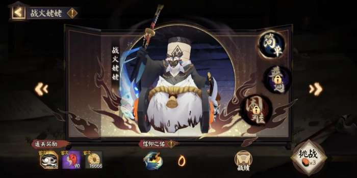 每个姥姥火副本都有简单、普通、困难三个难度,每次挑战消耗3点体力。每个副本的每个难度首次通关都有奖励,通关简单难度时即可获得御行达摩碎片、勾玉、金币、鬼王的馈赠,通关其他难度可获得金币、鬼王的馈赠等其他奖励。