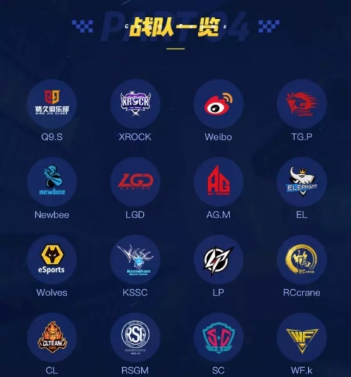 此次参赛的十六支战队分别是WEFUN(WF.K)、SC、TeamLP、XROCK、KSSC、EL、AG.M、LGD、Weibo、RCcrane、CL、Q9.S、RSGM、TG.P、Newbee、Wolves(以上排名不分先后)。