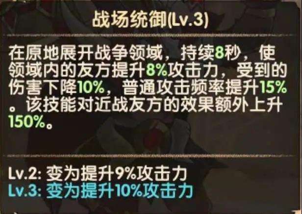 提升领域内友军至高10%的攻击力,受到伤害下降10%,普通攻击频率提升15%,对近战友军效果额外提升150%。