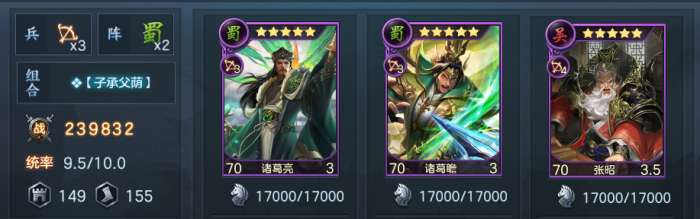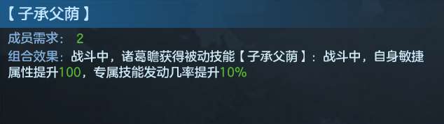 张昭的专属技能比较万能,搭配诸葛瞻和诸葛亮可以获得高额的收益。组合技【子承父荫】给了诸葛瞻最需要的敏捷属性和发动几率,100敏捷加成可以让诸葛瞻比肩菜刀队,能在菜刀队行动前放出专属技能保护队友。只是诸葛瞻的稳定性不佳,所以前期还是需要数阵过渡。