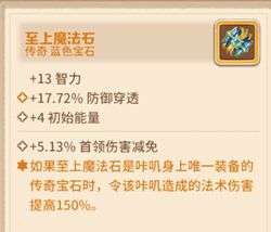 至上魔法石生效时,可以提供150%法术伤害(烙印传奇特效强化后200%),但要求是唯一装备的传奇宝石才生效,在手游版本因为没有神石,另外两个宝石位只能装备普通宝石。常见的组合是妮卡、法皇至上和2个普通的蓝宝石。等以后出了神石,至上可以组合双神石。