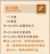 天火结晶在进入战斗时,给咔叽提供5层增益buff,每层提供20%伤害增强(烙印传奇特效强化后30%),之后每回合减少一层buff。装备多个天火时,层数保持5,增伤叠加。例如装备4个未烙印天火结晶,进入战斗时,有5层buff每层提供80%的增伤。好奇的小伙伴可能会问,咔叽就3个格子,怎么装4个天火?其实是利用用了超自然宝石的特性,可以实现4天火特效。