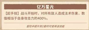 妮卡核心技能为为其二星技能【千亿星光】,该技能为起手技群攻伤害,在先攻组攻击完后优先释放,通过第五个天赋可以强化为【亿万星光】变为400%攻击力伤害。该技能配合法皇和至上魔法石,可以打出成吨输出。是科学家回合前输出无法秒怪时,接棒秒怪的好选择。