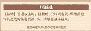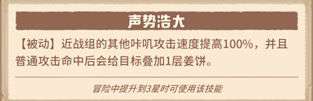 实际上斯威特本身也是个优秀的输出,但是他的领队技能【亮闪闪】实在太好用了,地下车过首领概率掉落未鉴定宝石,实在是居家旅行必备领队!三星技能增强技能【声势浩大】提供近战组攻击速度,并使同组咔叽也能给怪上【姜饼】debuff,因而斯威特更被大家熟悉的名字是“姜饼”。