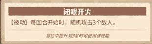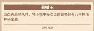 杰克的技能核心技能为其三星技能【随意开火】,通过第五个天赋可以强化为【闭眼开火】增加到攻击3个敌人。该技能为被动技能,也是少数的回合开始前就发动的输出技能。(在手游未来的版本,可以通过这个被动触发神石特效。)并且杰克的冠绝天赋领队技能【海贼王】可以提高刷图收益,(抛开输出不说,光领队技能的收益,个人也推荐速刷带上杰克)。