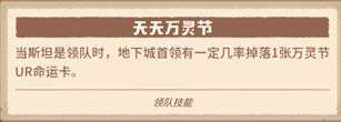 斯坦通过起手技和被动技给队友发糖进行辅助。但正真让他进入速刷组合的理由其实是它的冠绝领队技能【天天万灵节】,首领概率掉落万灵节UR卡片。增加收益的咔叽都是好咔叽,带上斯坦冲冲冲!