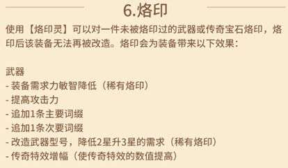 根据官方的百科,烙印武器可以得到6种烙印效果,烙印后武器无法再被改造。经大佬们的反复实践,实际对武器用途最大的不是稀有烙印,而是“提高攻击力”,烙印提高的攻击力是直接加在武器的初始攻击力上的,对输出提升明显。