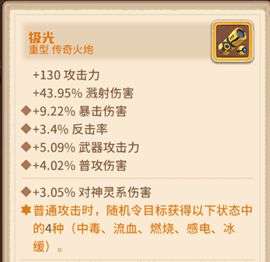 极光在普通攻击时,随机领目标获得中毒、流血、燃烧、感电、冰缓5种状态中的传奇特效值(1-5)种状态。由于炮手红色槽位(等开放神石后,红色的神石克己相杀非常强力)、燃烧机制和圣物熔火之心(普通攻击时造成敌人当前5%生命的伤害),这个版本炮非常强势。
