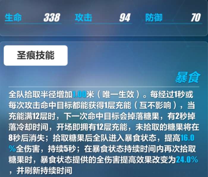 ∽每秒/每次攻击获得一层充能,开场拥有12层充能,12层充能以后,下一次命中会掉一颗糖,拾取后全队获得16%的全伤加成,5s持续时间,2s掉落cd。重复拾取刷新持续时间,且加成数值提高为24%。开场拥有12层充能