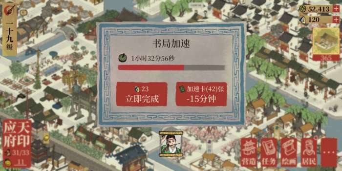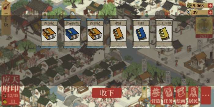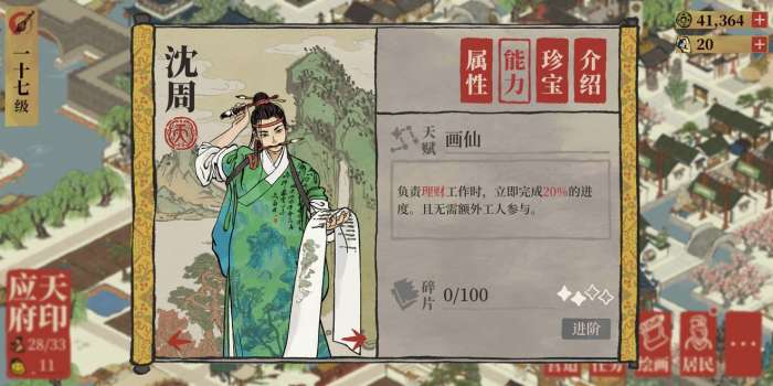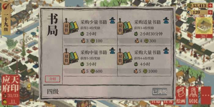 (这里因为我已经升满级书局了,所以目前在我所有的理财工作内,书局是需要最多人手的,所以我通常都是用沈周来刷书籍,而且是专职刷书籍工作的。