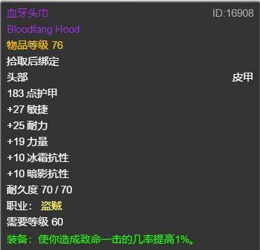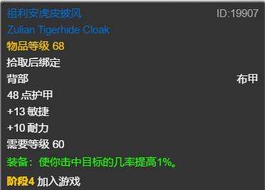 肩膀zug套装甚至比T2肩好用,底价捡。披风继续zug捡漏,加命中的披风掉落是蜘蛛,需要打全通团才能拿到,而且价格一般较贵,可以拿的是老虎掉落的28AP的披风凑合够用。