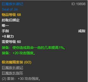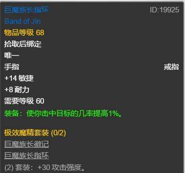 对戒提供了14敏16耐50AP1暴击1命中,丝毫不浪费属性。对比bis的艾古加屠龙大师,少了2敏2命中,多了1暴击2AP。艾古现在没有几千G根本拿不下