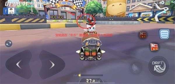 而宝藏的具体位置就是在图中圈出来的地方,宝箱就是在牛牛雕像旁边,大家在这个地图中选择好多人的竞速模式稍加留意还是很好找的。