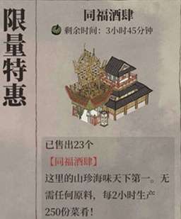 这个建筑叫做同福酒肆,需要花费30元才可以得到,作用就是可以产出菜肴,每2个小时可以产出250个菜肴,算是一个非常特殊的建筑,一般只会刚玩的时候才会出现显示购买,属于限量特惠,如果你错过了之后就没办法入手了,不过不排除后续会返场。所以暂时如果没办法得到的玩家只能这样期待了。