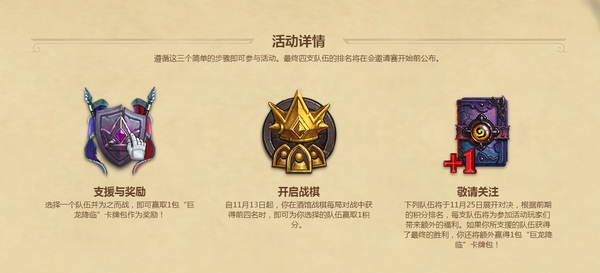 参与活动的方式也非常简单,在官网的活动页面选择一支喜爱的队伍,为其投票,投票后就可以获得一个巨龙降临卡包。11月13日酒馆战棋全面开放测试后,每在酒馆战棋对战中获得前四名,即可为选择的队伍积一分。