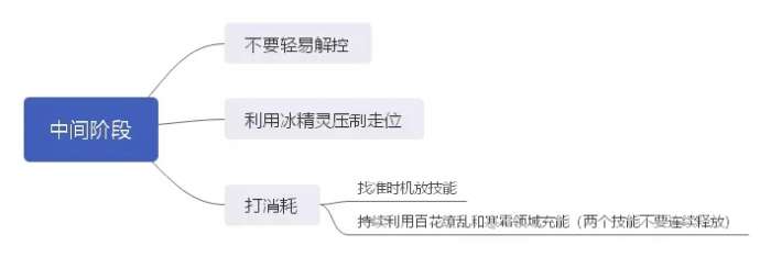 在中间对峙阶段,尽量不要被对方轻易逼出解控,因为寒策的大多技能都有前摇,在解控后很难第一时间反制到敌方,最好能在敌方以为你不愿意交解控,准备上来打你的时候,找好实际解控反制。其实第开局阶段互放技能之后,大概就会有50%以上的觉醒充能了,接下来其实你不用急躁,可以持续利用百花缭乱和寒霜领域远距离消耗继续为觉醒充能。这时候很多朋友可能会疑惑,这两个技能cd不是挺久的吗,怎么持续消耗呢?
