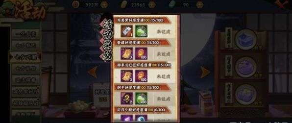 然后再来看下图这个今天上线的“七夕巧果”活动界面,是不是完全一样?只是背景和食物发生了变化,其余的没有太大变化,都是需要收集食材送给对应的忍者,好感度达到100%后就可以领取对应的奖励,并且还有每天三次挑战关卡拿食材的方式。