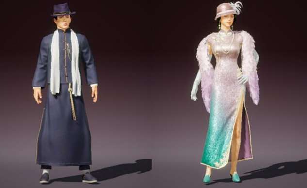 目前爆出了三款套装,首先是“不夜海上花”,光听名字就很有感觉,女款是一身渐变色的旗袍,披着粉紫色的貂,穿绿色小皮鞋,带白色手套,最后头上那顶小圆帽让整体韵味更足了。男款则是经典上海滩大哥形象,白色围巾+黑色礼帽。男女款在一起颇有几分许文强和冯程程的感觉。