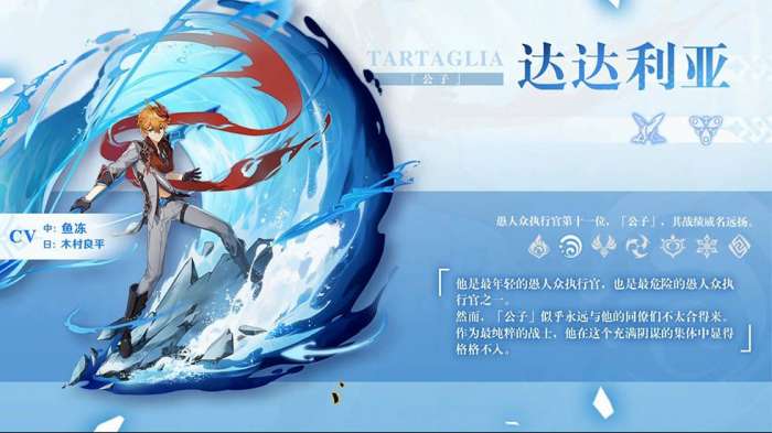首先是公子达达利亚,他是本次新增剧情中的反派角色,神之瞳为水元素,水元素终于迎来了第四人,而且是水弓,不过他是唯一一个可以近战和远程随时切换战斗的角色,五星。