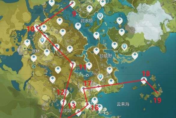 文字流:9.轻策庄-10.奥藏山-11.翠玦坡/渌华池(左方)-12.遁玉陵(七天神像)-13.灵矩关-14.青墟浦-15.天衡山(下方)-16.天衡山-17.天衡山(上方)-18.孤云阁传送点-19.孤云阁副本;