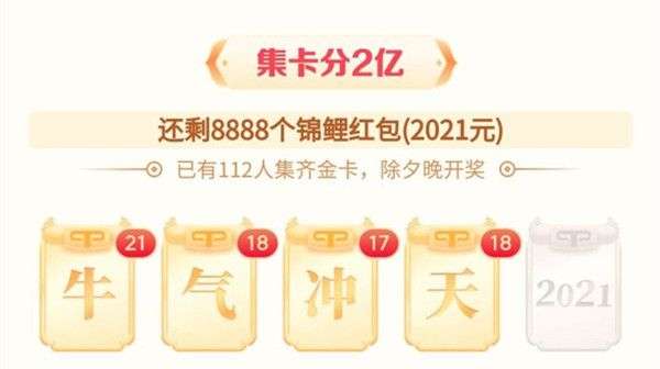 活动期间,大家集齐【牛】,【气】,【冲】,【天】,【2021】五张金卡,即可获得金卡红包资格,和其他集齐金卡的用户平分1亿红包。
