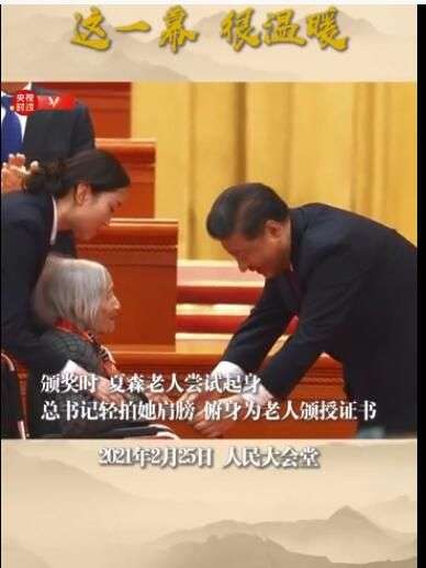 98岁的夏森老人坐着轮椅上台领奖。颁奖时,夏森老人尝试起身向总书记致意,总书记轻拍她肩膀,俯身为老人颁授证书。全场响起热烈的掌声。