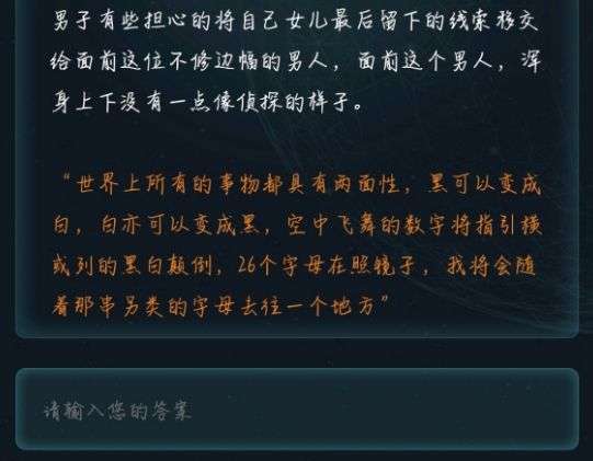 “世界上所有的事物都具有两面性,黑可以变成白,白亦可以变成黑,空中飞舞的数字将指引横或列的黑白颠倒,26个字母在照镜子,我将会随着那串另类的字母去往一个地方”