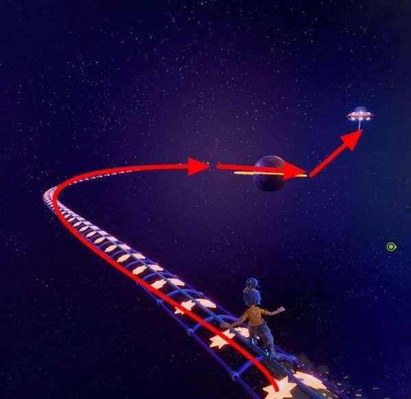 第四个导体:台子后面的跷跷板,小梅在右边,科迪变小从左边进入左侧建筑,通过火箭到上层获得。