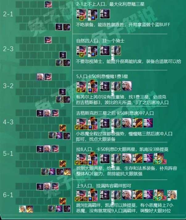 阵容简单到有没有眼泪都可以,装备合适就做就可以了,但是小恶魔不多记得不能玩,优先克烈和吉格斯的装备,前期碰到的对手弱一点开局5连胜都很正常,小恶魔一定不要忽视了骑士,多15的减伤很重要,开局三小恶魔最佳,其次是双骑士挂吉格斯,前期不要上重骑。