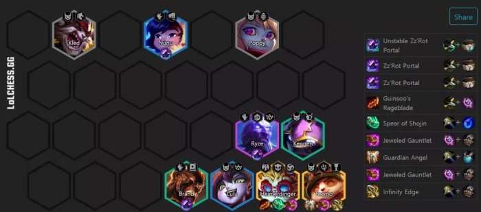 2-1拉4人口,4人口克烈、日女、波比、炸弹人凑出3小恶魔2骑士羁绊,有黑传送门优先做出传送门,其他法强装备直接丢给炸弹人过渡使用。传送门+小恶魔是前期连胜的关键。