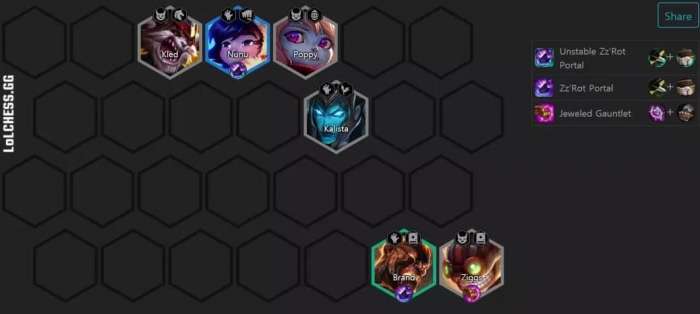 丧尸羁绊的关键就是传送门,最佳的搭配是2白1黑,黑传送门虽然可以带来爆破的效果,但是在后期白传送门才是阵容坦度的关键。后期只要围绕着提莫做防护,那么就不缺黑虫子这点伤害了