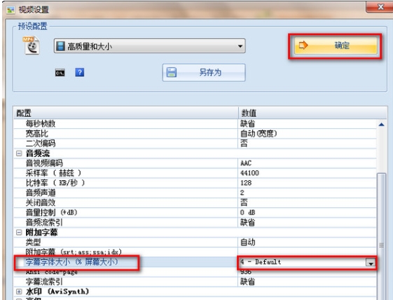 注意:选择字幕字体的大小,主要是相对于屏幕大小来说,然后点击“确定”。