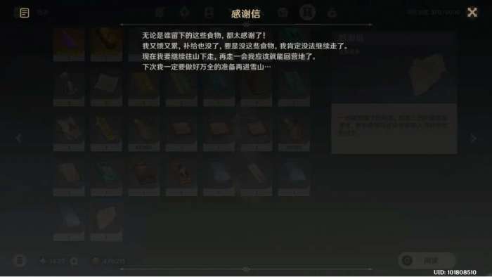 做完应急补给任务后,如果第二天再去补给点的话可以找到一个道具【感谢信】,是来自于想要进入雪山的冒险家的,算是一个彩蛋吧。