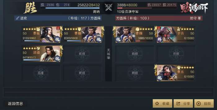 利用郭嘉抢1速,先人一步施加沉默与禁疗,曹操2速触发挟主行令再次施加沉默与缴械,曹植3速发动通智令昏,因为通智令昏CD与队伍输出链都为10秒,后续再次触发的伤害会享受通智令昏带来的减值效果,并且为队伍带来10秒一次的输出周期和控制周期,在面对主动队伍时几乎能让敌方全程罚站挨打,也正是由于克制主动队的特性,该队伍无论是穿10还是PVP都非常强力,挑选正确的野地去攻打,战损会比黄天队伍低许多。
