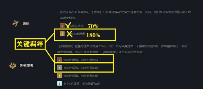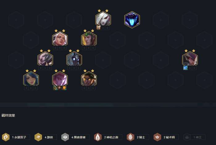 阵容运营关键羁绊:4与2/4黑夜。阵容主C月男,副C莫甘娜、诺手、皎月、艾希均可。