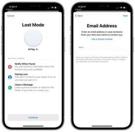 丢失模式新增的选项可让您为 AirTag 和“查找”网络的配件添加电子邮件地址来代替电话号码