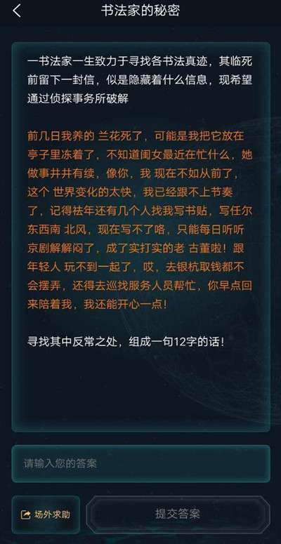 犯罪大师书法家的秘密答案是什么,相信很多小伙伴都不清楚,那么具体的破解技巧是什么,下面为大家介绍犯罪大师书法家的秘密答案详解。