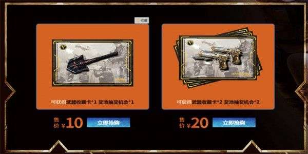 武器收藏卡介绍:玩家可在活动页选择购买10元档、20元档,抽取武器收藏卡;点击立即抢购将直接跳转至道聚城-订单提交页面,支付成功后会自动掉落并提示获得的具体武器卡款式;购买10元档将随机掉落1张武器收藏卡并赠送1次传说秘宝抽奖次数,20元档将随机掉落2张武器收藏卡并赠送2次传说秘宝抽奖次数;玩家在活动页购买时需登录并绑定游戏账号,并在购买前填写选择收件地址;抽取/领取的游戏道具将于发往【聚诚品-领取中心】
