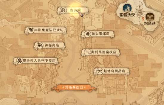 没有解锁的玩家可以点击【对角巷街口】,然后往前走到底找到“古灵阁巫师银行”即可。