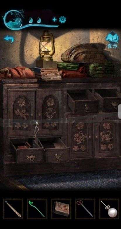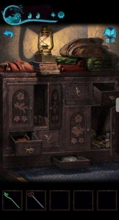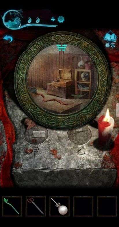 打开山洞里刚才的房间,进去先翻柜子,得到一只珍珠耳环,知道了莫琪的事。再用老婆的手链把胶带扯开,打开得到神像和蜡烛。