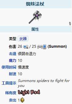 蜘蛛法杖是一把困难模式中的召唤武器,可以召唤蜘蛛为玩家作战。蜘蛛可以爬墙,并有着很高的跳跃高度。
