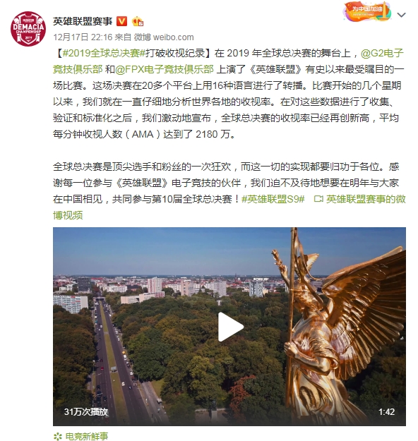 12月17日晚,英雄联盟赛事宣布2019全球总决赛打破收视记录。S9总决赛G2对战FPX,这场比赛在20多个平台上用16种语言进行了转播。