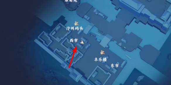 3、之后我们需要前往西市下图位置,找到小吃摊老板并与之对话。