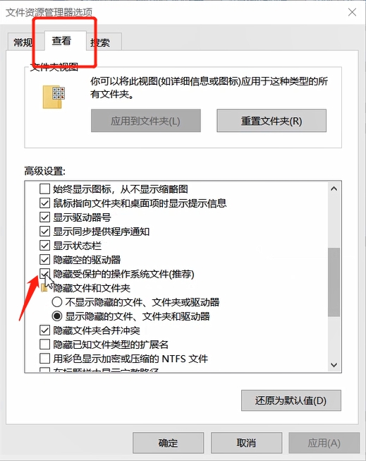 在上方选择查看,然后将隐藏受保护的操作系统文件取消勾选,是。